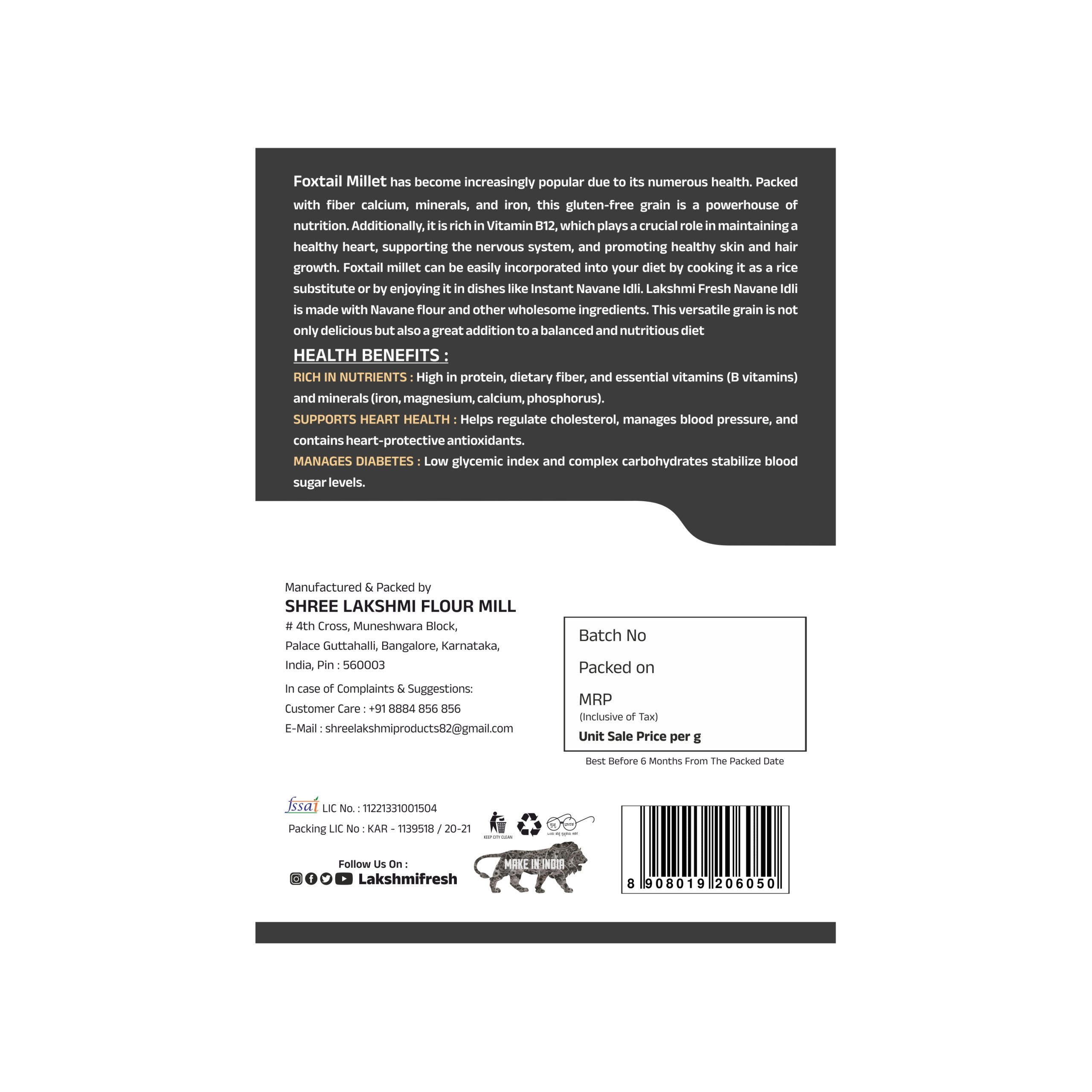 Foxtail Millet has become increasingly popular due to its numerous health. Packed with fiber calcium, minerals, and iron, this gluten-free grain is a powerhouse of nutrition. Additionally, it is rich in Vitamin B12, which plays a crucial role in maintaining a healthy heart, supporting the nervous system, and promoting healthy skin and hair growth. Foxtail millet can be easily incorporated into your diet by cooking it as a rice substitute or by enjoying it in dishes like Instant Navane Idli. Lakshmi Fresh Navane Idli is made with Navane flour and other wholesome ingredients. This versatile grain is not only delicious but also a great addition to a balanced and nutritious dietFeatures :