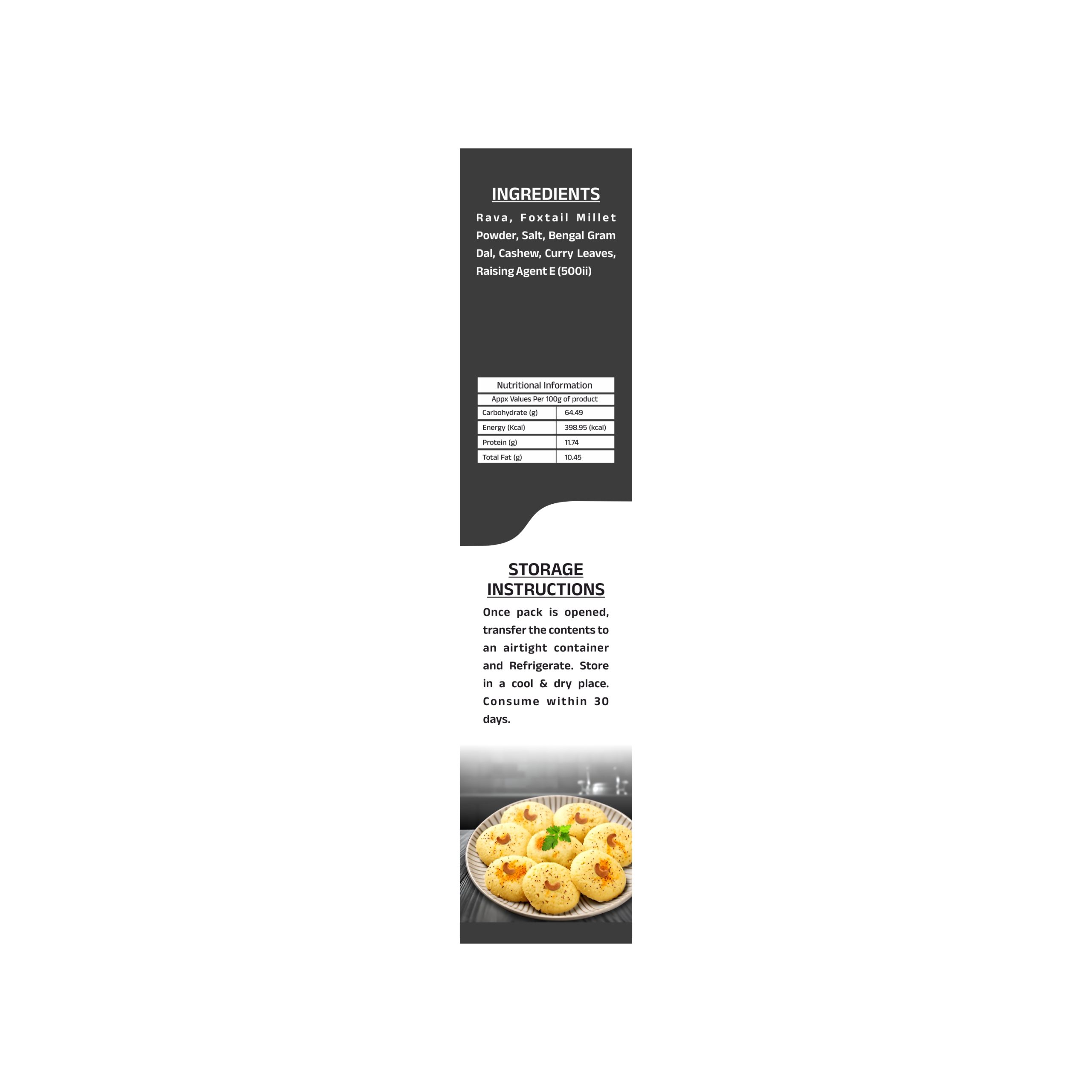Rava, Foxtail millet powder, Salt, Bengal Gram dal, Cashewnut, Curry Leaves, Raising Agent E (500ii)Shelf Life :